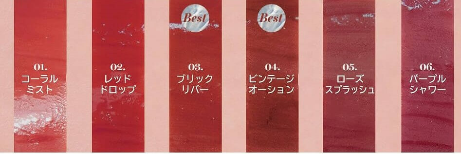 ロムアンドのグラスティングウォーターティントは全体的に肌の色を選ばず使いやすいカラーが多いなぁと感じました。