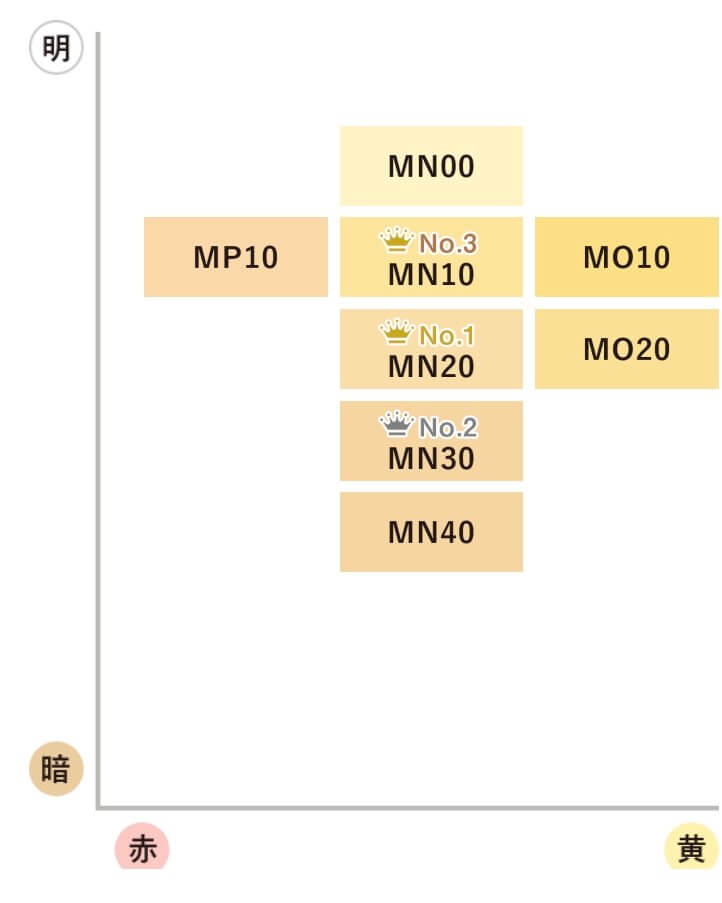 赤みにも黄みにも寄りすぎてない中間色のMNシリーズが一番人気みたい。