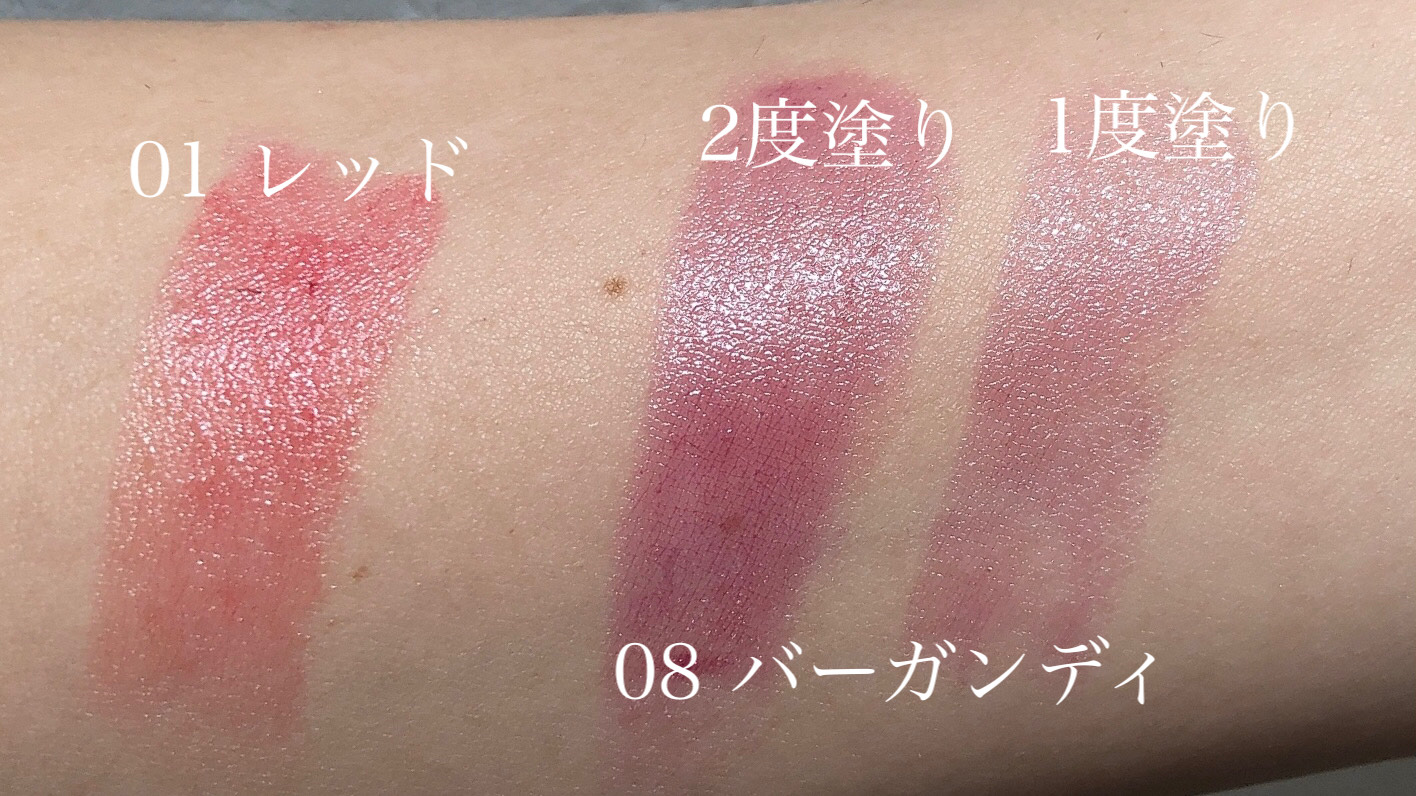 #01レッドと比べると分かりやすいですが#08バーガンディはかなり紫っぽいカラーです。