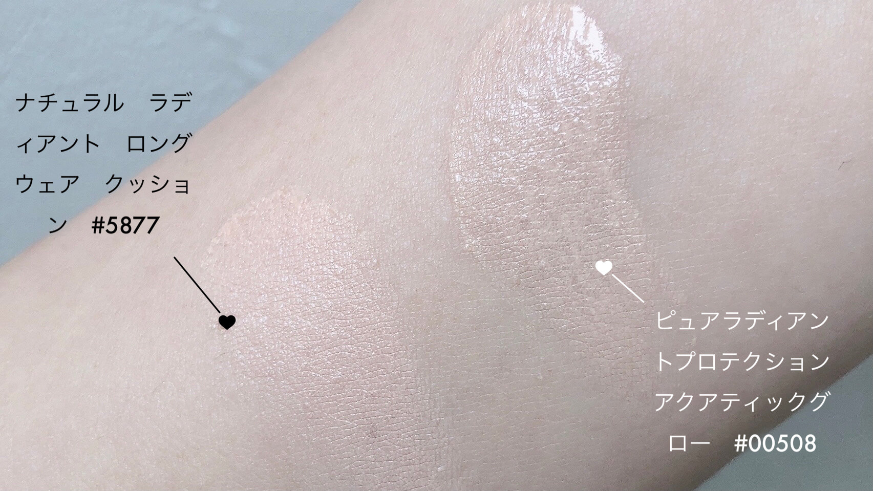 ただ、ナチュラルラディアント#5877のほうがピンクみが強いのと透け感があんまりない分白く見えます。