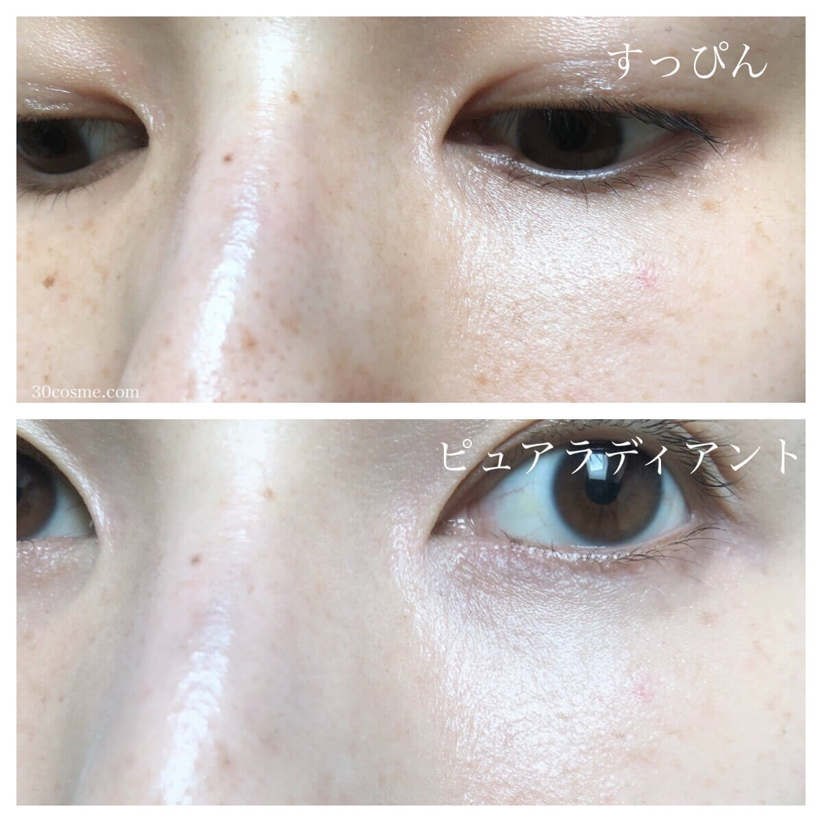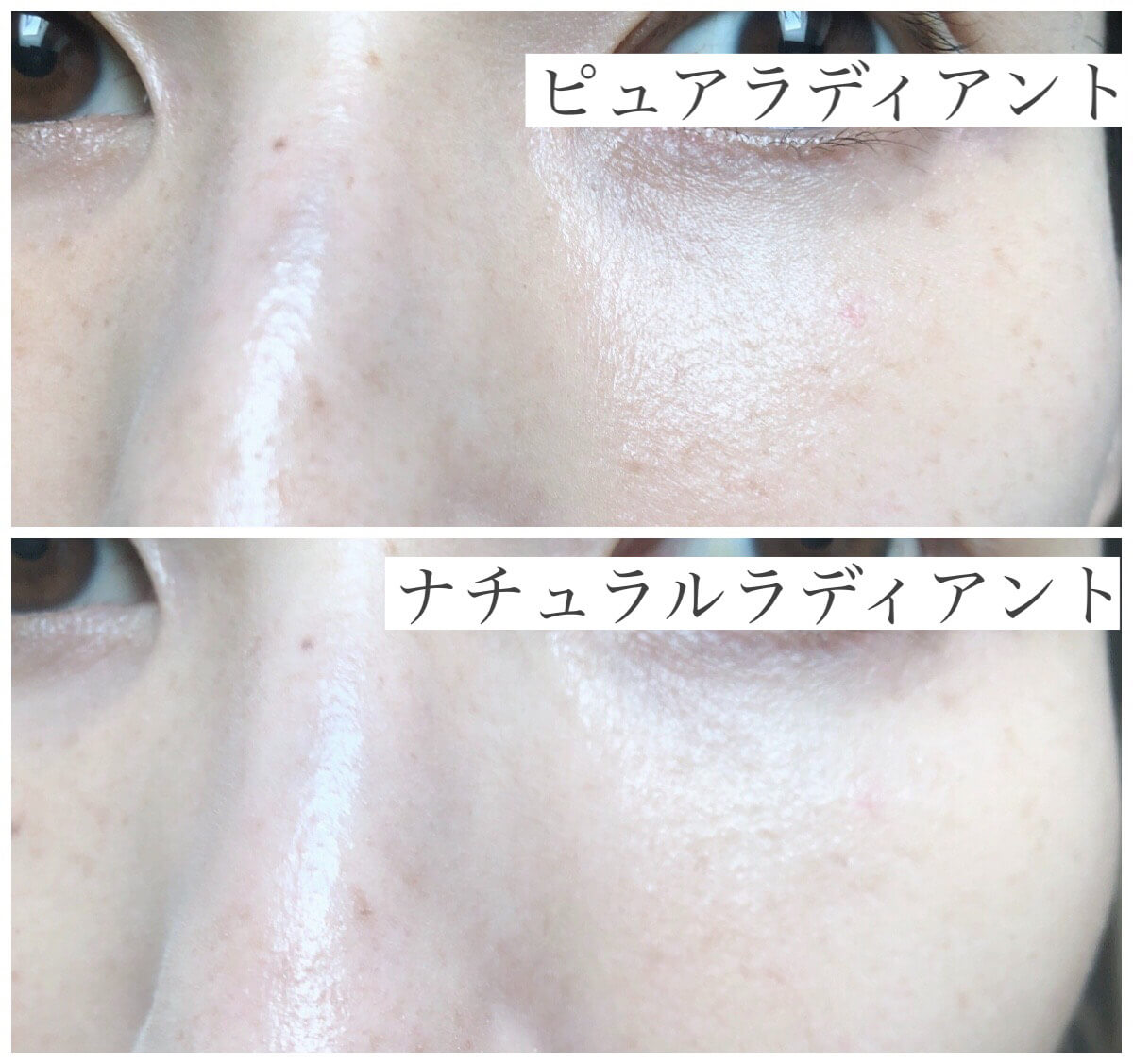 新作ピュアラディアントの方がみずみずしくて肌になじむので少し落ち着いてみえます。