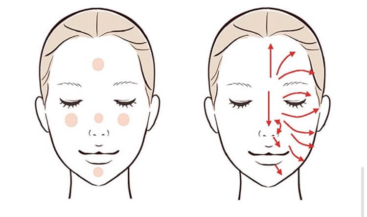 化粧水などで肌を整えた後、ディスペンサー1回押し分を手のひらにとり、両ほお、額、鼻先、あごにおき、顔の中心から外側へ伸ばします。